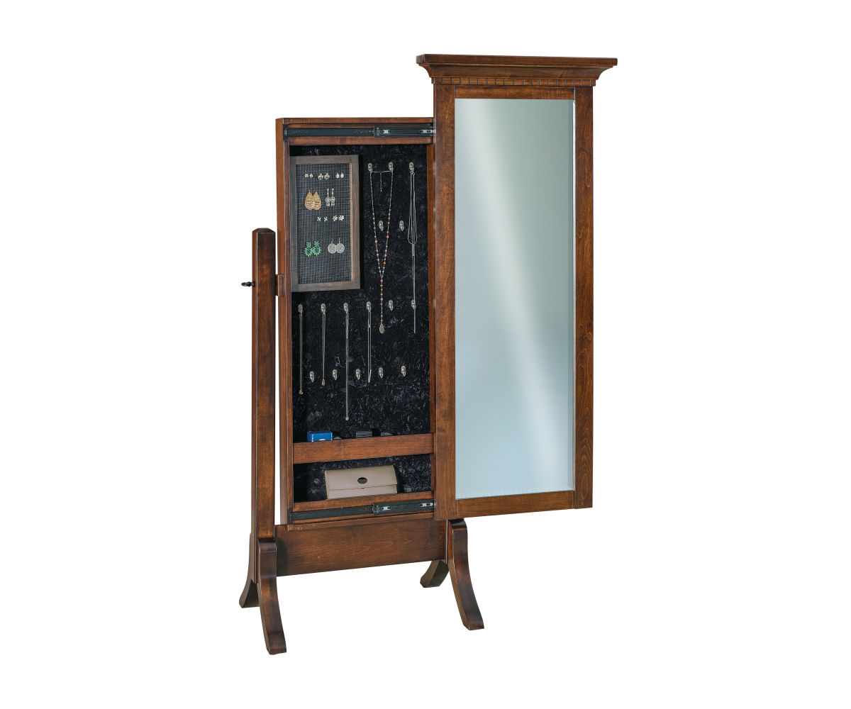 • Sliding mirror conceals a jewelry storage